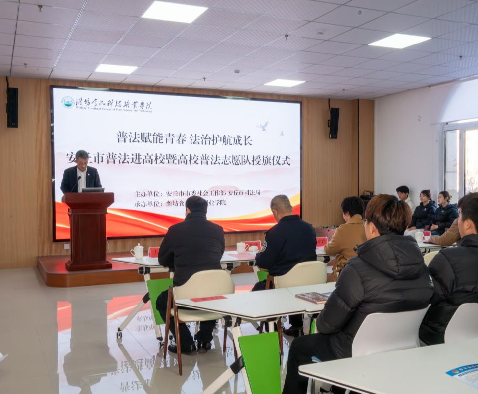 12月25日,“普法赋能青春 法治护航成长”安丘市普法进高校暨高校普法志愿服务队授旗仪式在我校举行。本次活动由安丘市委社会工作部、安丘市司法局联合主办,潍坊食品科技职业学院承办,相关单位分管负责同志及60余名师生代表参加。